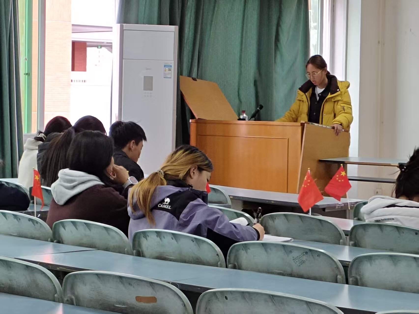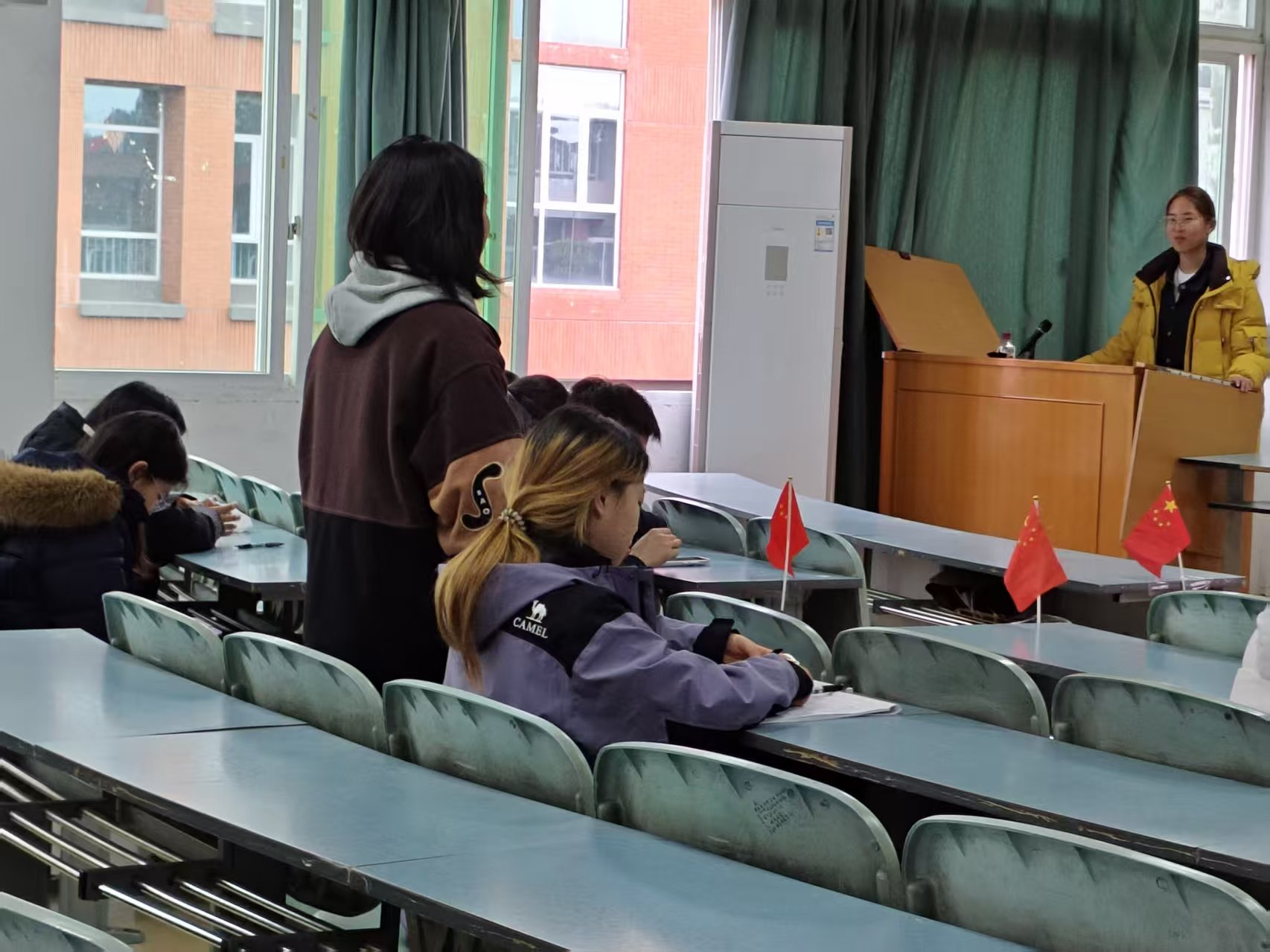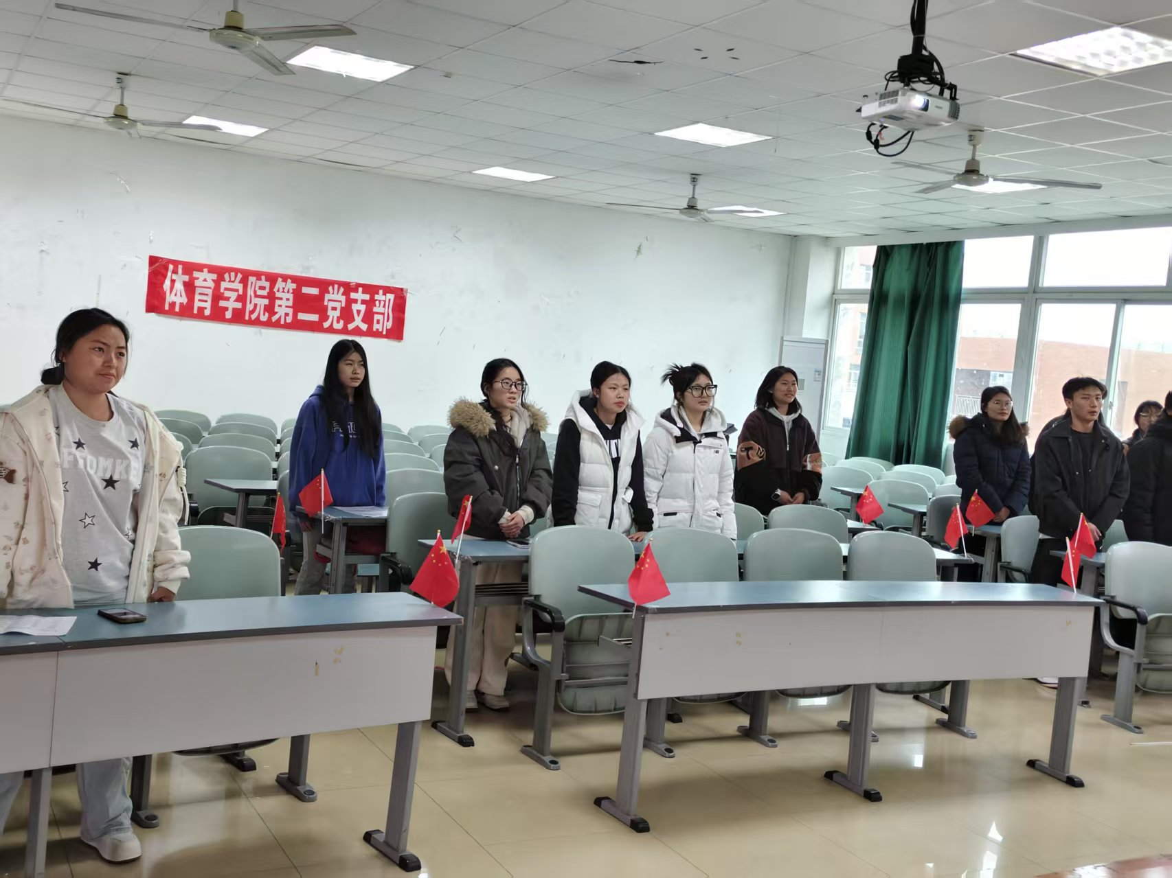 会议伊始,全体党员整齐起立,齐唱《国际歌》,在激昂的旋律中凝聚初心力量,筑牢思想共识,为本次学习会拉开序幕。现场摆放的小国旗与“体育学院第二党支部”横幅交相辉映,营造出庄重热烈的学习氛围。