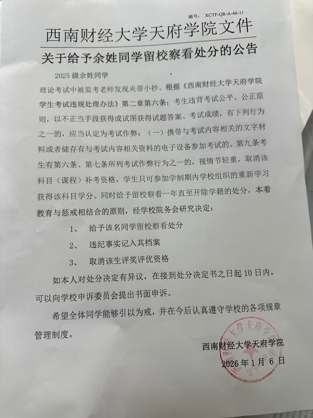 3.2025级余姓同学,理论考试中被监考老师发现夹带小抄。根据《西南财经大学天府学院学生考试违规处理办法》第二章第六条:考生违背考试公平、公正原则,以不正当手段获得或试图获得试题答案、考试成绩,有下列行为之一的,应当认定为考试作弊:(一)携带与考试内容相关的文字材料或者储存有与考试内容相关资料的电子设备参加考试的。第九条考生有第六条、第七条所列考试作弊行为之一的,视情节轻重,取消该科目(课程)补考资格,学生只可参加学制期内学校组织的重新学习获得该科目学分。同时给予留校察看一年直至开除学籍的处分,本着教育与惩戒相结合的原则,经学校院务会研究决定:给予该名同学留校察看处分。