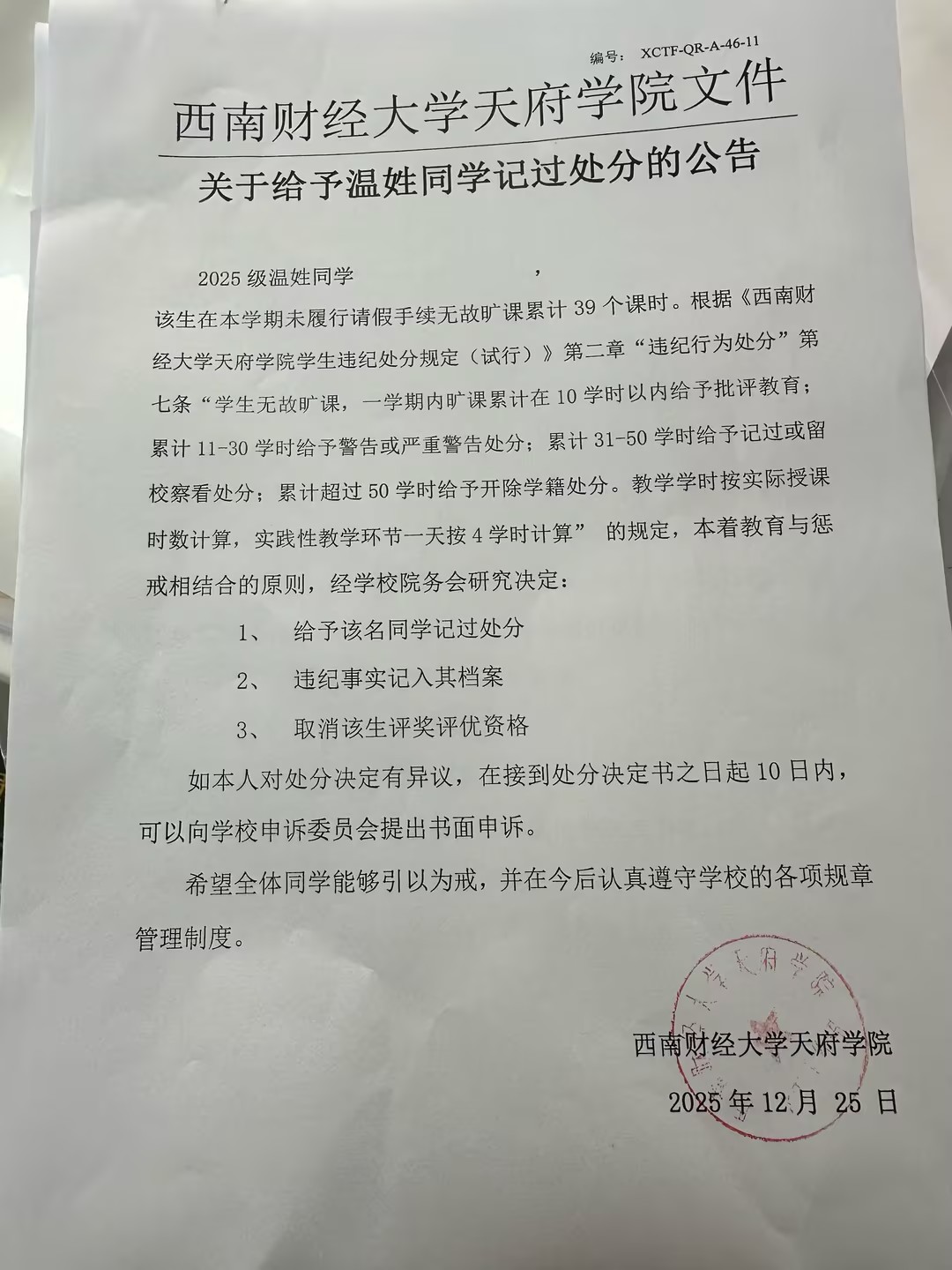 1.2025级温姓同学,该生在本学期未履行请假手续无故旷课累计39个课时。根据《西南财经大学天府学院学生违纪处分规定(试行)》第二章“违纪行为处分”第七条“学生无故旷课,一学期内旷课累计在10学时以内给予批评教育;累计11-30学时给予警告或严重警告处分;累计31-50学时给予记过或留校察看处分;累计超过50学时给予开除学籍处分。教学学时按实际授课时数计算,实践性教学环节一天按4学时计算” 的规定,本着教育与惩戒相结合的原则,经学校院务会研究决定:给予该名同学记过处分。