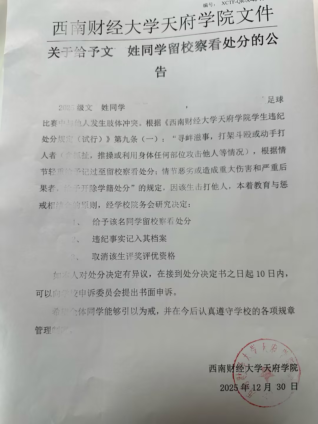 2.2025级文姓同学,体育比赛中与他人发生肢体冲突。根据《西南财经大学天府学院学生违纪处分规定(试行)》第九条(一):“寻衅滋事,打架斗殴或动手打人者(含抓扯,推搡或利用身体任何部位攻击他人等情况),根据情节轻重给予记过至留校察看处分;情节恶劣或造成重大伤害和严重后果者,给予开除学籍处分”的规定,因该生击打他人,本着教育与惩戒相结合的原则,经学校院务会研究决定:给予该名同学留校察看处分。